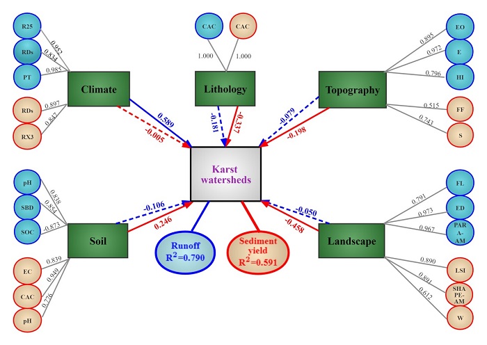 雷竞技raybet 环江喀斯特生态系统观测研究站研究团队为解决上述问题,选取西南地区40个典型喀斯特流域,获取了2009年至2012年径流和输沙量数据,提取不同喀斯特流域降雨、岩性、土壤、地貌和植被因子共103个,采用皮尔逊相关和随机森林筛选影响径流和产沙的主导因素,并利用偏最小二乘-结构方程模型(PLS-SEM)解耦径流和产沙与其潜在影响因素之间的复杂关系。结果表明,气候、岩性、土壤、地貌和植被可解释不同喀斯特流域79%的径流变化,其中仅有降雨对径流有显著影响(P<0.01,路径系数(β)=0.589);气候、岩性、土壤、地貌和植被可解释产沙变异的59%,其中植被对不同喀斯特流域产沙量的影响最大(P<0.01,β=-0.458),而降雨对不同喀斯特流域产沙量没有显著影响。本研究通过解耦降雨、岩性、土壤、地貌和植被对不同喀斯特流域产流产沙的影响,研究结果对于深入理解喀斯特区侵蚀产沙机理和水土保持措施的优化配置具有重要意义。